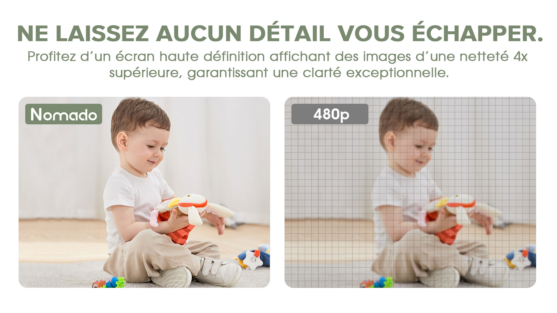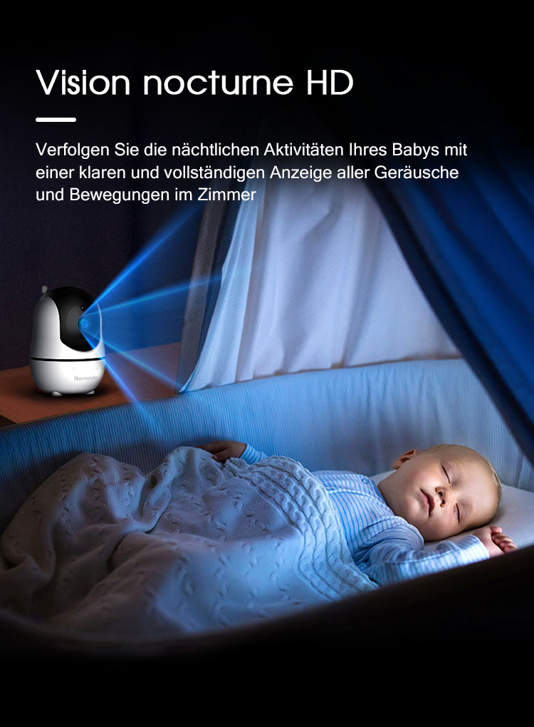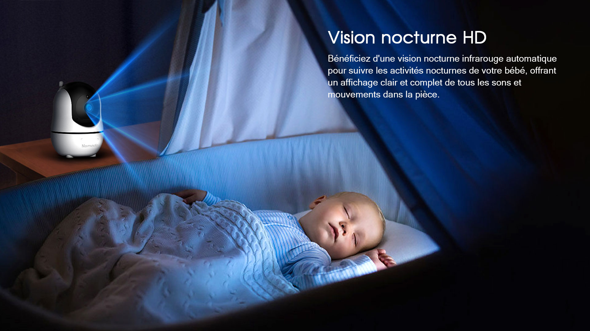 Dites adieu aux préoccupations diurnes et nocturnes avec l'écoute-bébé Nomado ! La vision nocturne automatique offre des images claires en noir et blanc même dans l'obscurité totale, sans lumière rouge pouvant perturber votre bébé. La batterie de 4000 mAh assure 25 heures de surveillance en mode VOX, économisant l'énergie en interrompant la transmission dans les pièces calmes, ne vous alertant qu'au premier son.